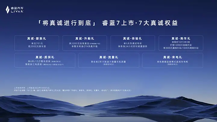 除了产品的真诚,此次全球上市发布会睿蓝7还为我们带来了更具吸引力的政策——保留预售期10万3年0息等优惠福利,睿蓝7还新增了首任车主6年/15万公里质保、赠送便携式直流充电枪、2000元选装基金等惊喜福利。