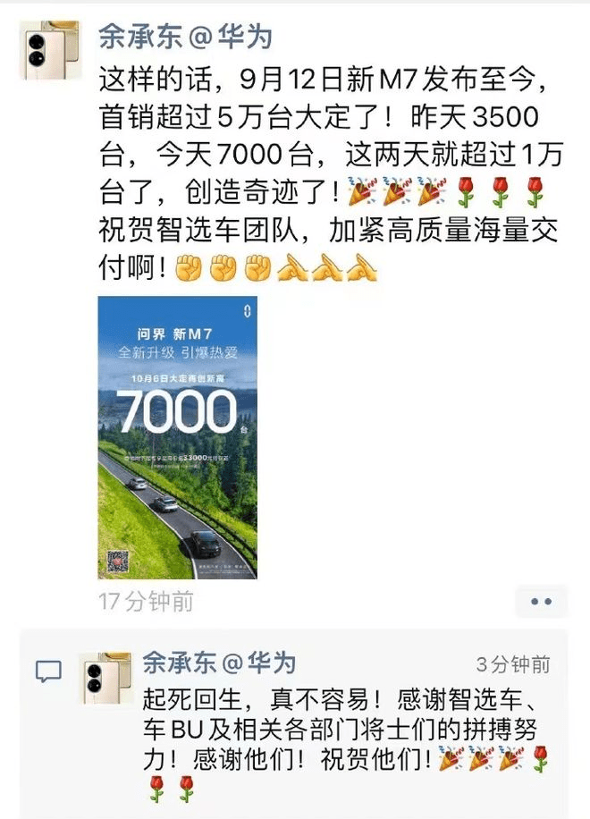 近日,华为常务董事、终端BG CEO、智能汽车解决方案董事长余承东在朋友圈发文,声称9月12日新M7发布至今,首销已超过5万辆大定。
