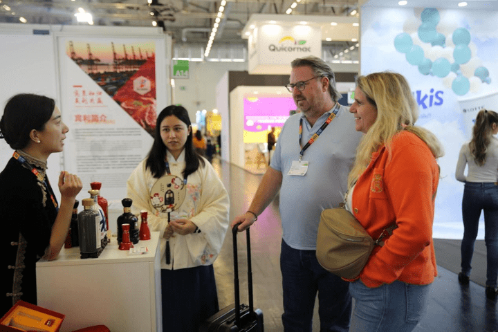 古井贡、黄鹤楼、老明光三大名酒大家族精彩亮相,年份原浆系列中国龙的瓶身设计,古韵悠悠的浓香型风味口感,以及饱含古井文化的步步高升酒具吸引了众多国内外友人的关注和驻足品鉴。独特的“中国色”成为了现场亮丽的风景线。来自匈牙利、意大利、葡萄牙等海外意向经销商主动上前咨询,通过介绍对古井贡酒文化和产品进行详细地了解,为古井贡酒开拓海外市场,古井贡酒品牌国际化发展助力。