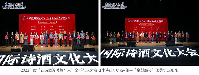 全球征文大赛是国际诗酒文化大会最具亮点和群众参与性的活动之一。今年,征文大赛在赛制设置、奖项设置、奖金设置等方面再度升级,共征集到来自世界各地超过40万首优秀作品,掀起全民诗歌创作、诗歌分享的热潮。开幕式现场举行了“让诗酒温暖每个人”全球征文大赛颁奖盛典,现代诗组、旧体诗组各20人获颁“金麒麟奖”,现场嘉宾共同见证了大众诗歌文化繁荣发展的又一重要时刻。