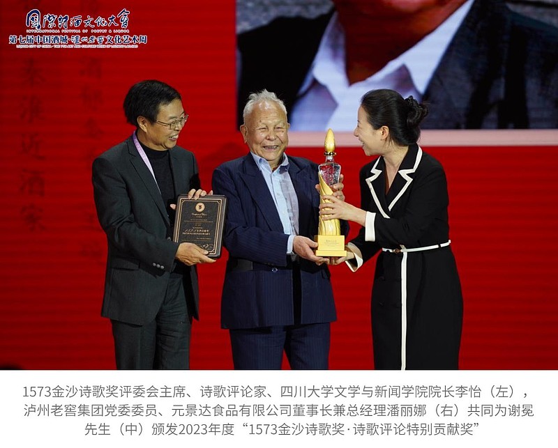 自2021年起,泸州老窖与四川大学中国诗歌研究院合作设立专门面向诗歌评论和诗歌文献收藏的“1573金沙诗歌奖”。开幕式上,2023年度“1573金沙诗歌奖”将最高奖“诗歌评论特别贡献奖”授予文艺评论家、诗人、作家谢冕,致敬他择一事终一生,为新诗作出的卓越贡献。