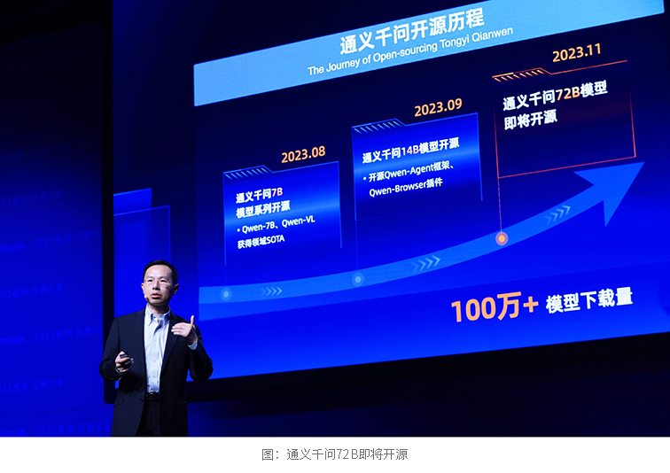 周靖人透露,阿里云计划近期开源通义千问72B版本,此前,阿里云已先后开源7B和14B版本模型,模型累计下载量超过100万。阿里云将持续支持千行百业的开发者基于通义千问开源模型进行模型和应用创新。