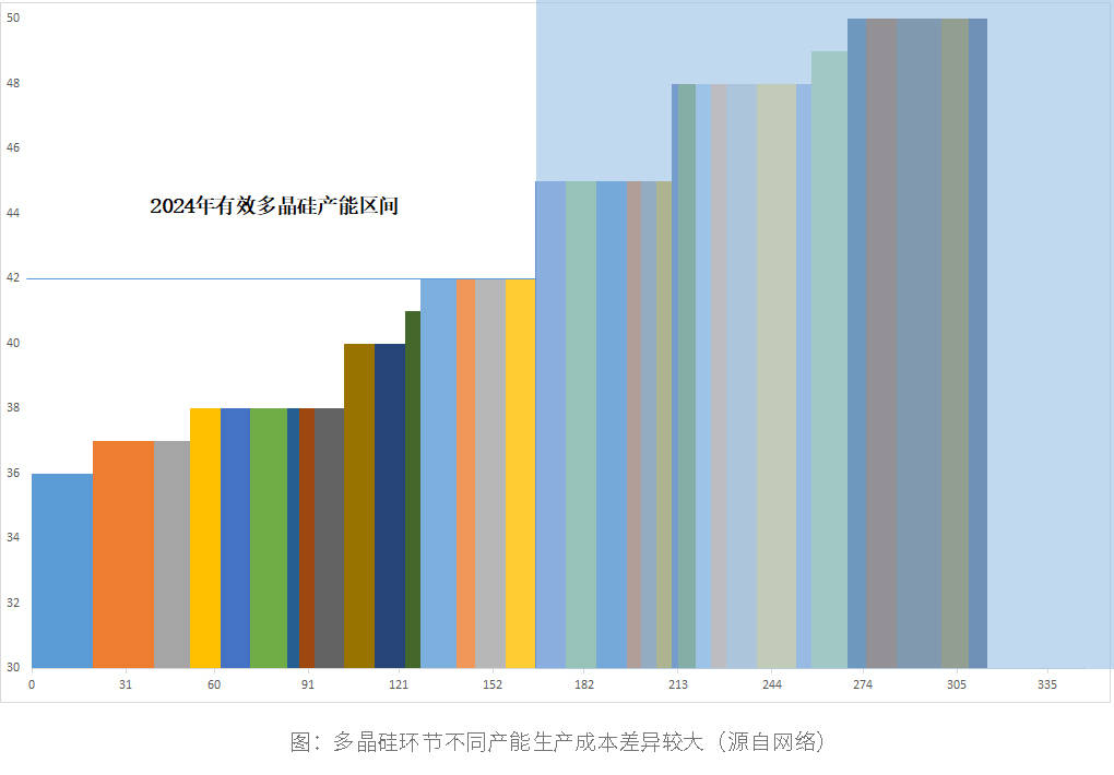 首先,不同于其他环节单个项目投资规模小,进入门槛低,企业跨界相对容易,多晶硅环节头部企业集中,项目规模大,企业之间的成本差异显著大于其他环节企业之间的成本差异,这将导致在面临相似的过剩压力时,多晶硅环节企业的优势产能相比于其他环节的优势产能具有更强的盈利能力。