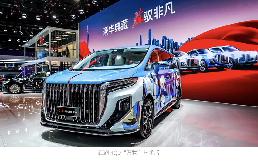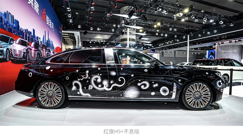 本届车展,红旗还展出了两款特别联名车型。其中,红旗H9+不息版是“新高尚美学”倡议下的首款艺术家合作产品,由研发总院造型设计院与艺术家陈琦共同完成,以《时间简谱》为灵感,将红旗H9+的外观及内部空间进行了一场中国传统元素和当代艺术与现代高科技工业产品的深度融合。而红旗HQ9“万物”艺术版的设计是与画家郭子良共创完成,以“静观万物之来去”的文化精神为土壤,采用手绘车身、非遗工艺等种种视觉表达手段,使得红旗HQ9“万物”艺术版成为一个集优秀传统文化、当代工业与现代艺术于一体的工业艺术品。长久以来,红旗致力于在汽车工业上转化传统文化与现代艺术,通过对本土优秀文化的研究与理解,融合当代审美趋势,使用艺术创作及工业设计手段打造汽车产品,传递好中国优秀传统文化。