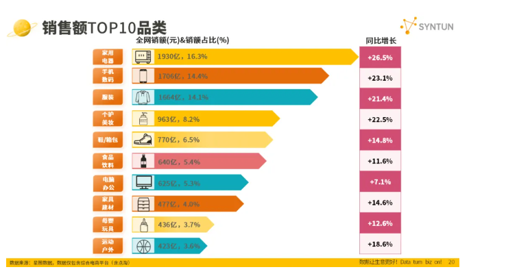 其中,综合电商平台(天猫不含点淘)总计销售额为11093亿元,同比增长20.1%,比去年表现更好 ;直播电商销售额为3325亿元,同比增长54.6%,增长势头明显。