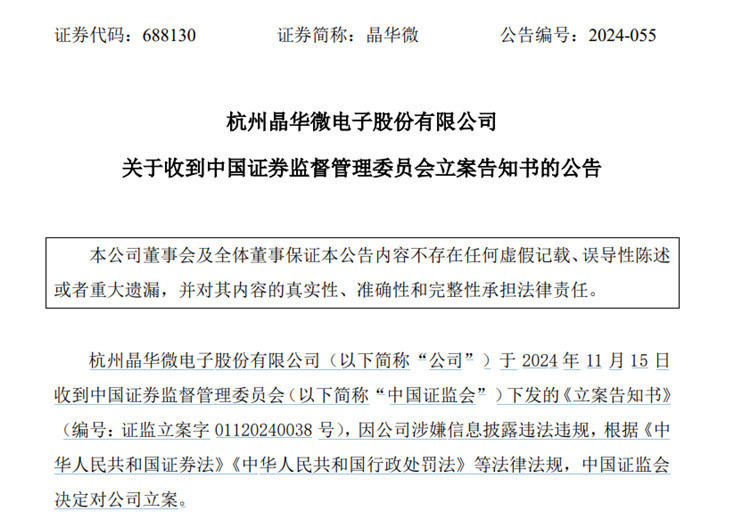 近日,晶华微发布公告称,公司于 2024 年 11 月 15 日收到中国证券监督管理委员会(以下简称“中国证监会”)下发的《立案告知书》(编号:证监立案字 01120240038 号),因公司涉嫌信息披露违法违规,根据《中华人民共和国证券法》《中华人民共和国行政处罚法》等法律法规,中国证监会决定对公司立案。