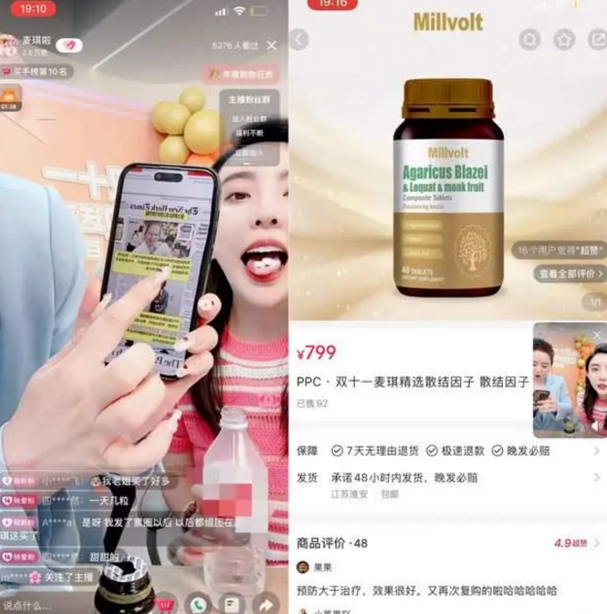 蓝鲸记者查询发现,“麦琪啦”带货商品多以珠宝、护肤和保健品为主。而在她售卖保健品时,不少功效却被宣传得天花乱坠。