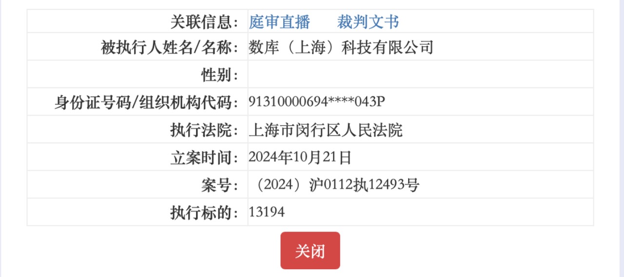 蓝鲸新闻11月26日讯(记者 张书维)日前,蓝鲸新闻注意到,数库(上海)科技有限公司(下称“数库科技”)被上海市闵行区人民法院发布限消令。