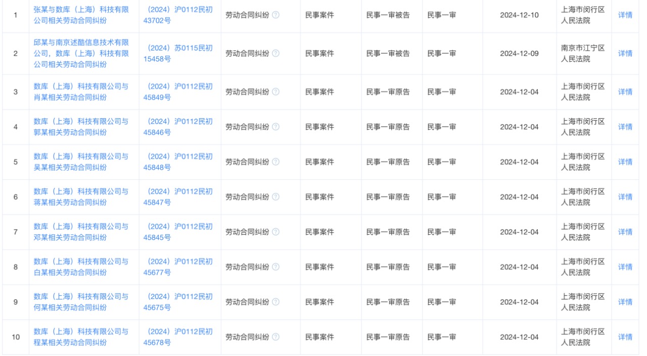 除此之外,蓝鲸新闻注意到,天眼查数据显示,数库科技新增十余起开庭公告,案件多涉及劳动合同纠纷。