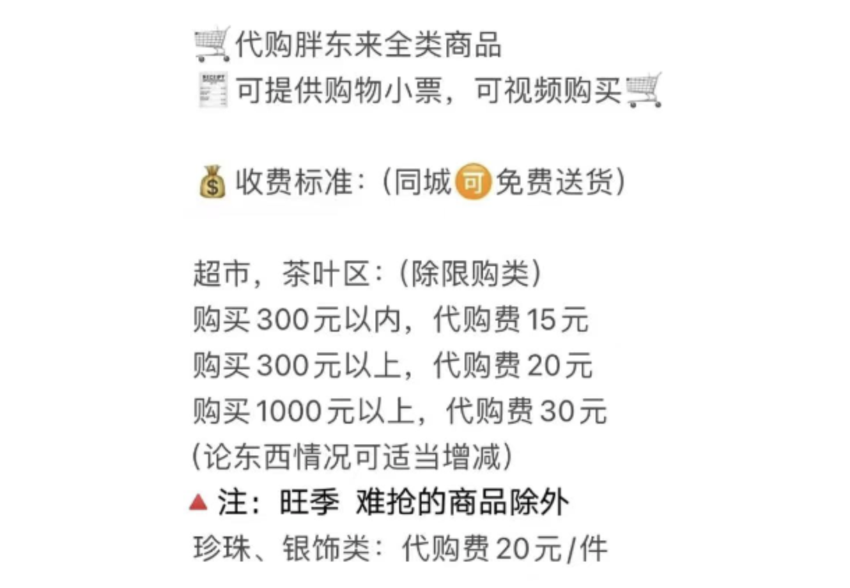 他们根据购买商品的总额分级向消费者收取代购费,例如300元以内收取15元,1000元以上收取30元。