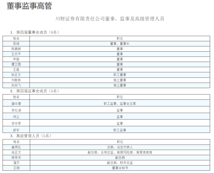 记者查询发现,据川财证券官网披露的董监高人员信息,公司第四届董事会成员中,包括职工董事和独立董事在内的董事共有9人,分别为吴琼、陈昌银、王志平、宋丽、谭卫国、王超、徐正文、刘胜良、沈剑飞;监事会成员5人,分别为雒冬春、李红淑、何立、李亦军、舒宇。