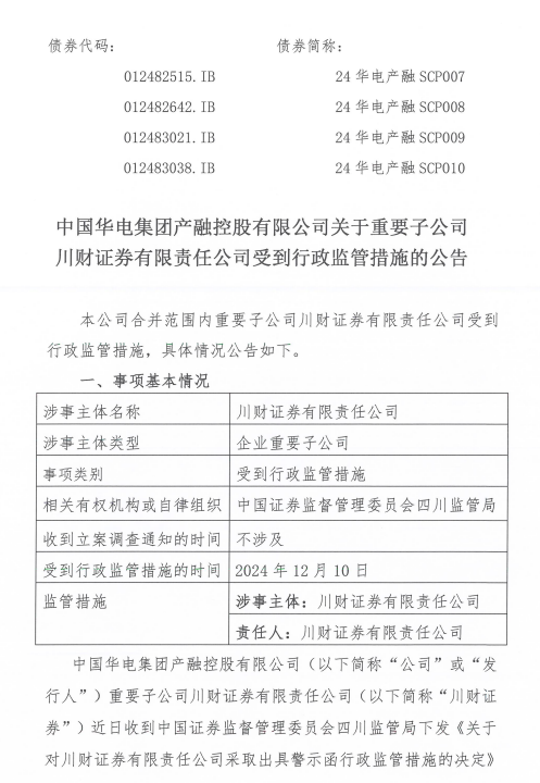 蓝鲸新闻12月21日讯(记者 胡劼)记者关注到,近日,中国华电集团产融控股有限公司(下称“华电产融”)公告,12月10日,旗下重要子公司川财证券有限责任公司(下称“川财证券”)收到来自四川证监局出具的警示函。