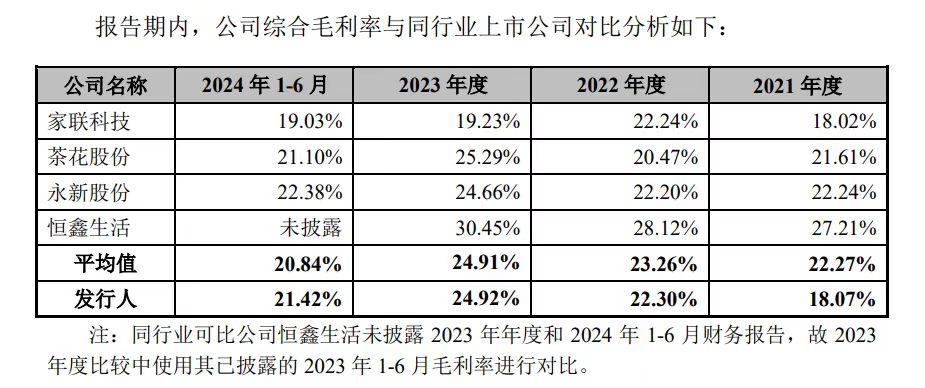 家联科技于2021年登陆资本市场,恒鑫生活也已提交创业板IPO申请,从毛利率角度看,富岭股份2024年1-6月毛利率为21.42%,低于2023年24.92%和2022年22.30%的毛利率水平,但近两年综合毛利率仍略高于行业平均水平。