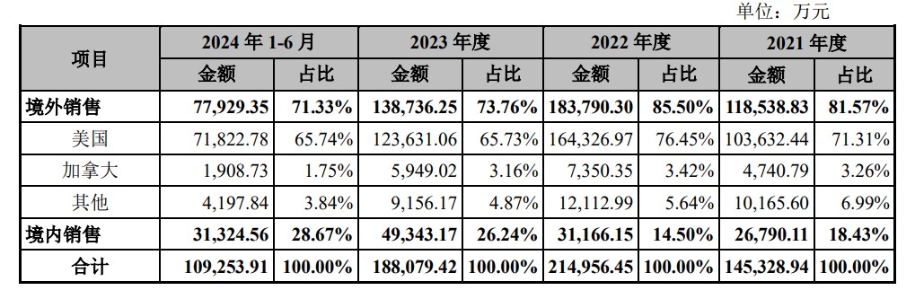 这也导致富岭股份对美国市场的依存度较高,招股书显示,富岭股份2021-2023年营收分别为14.58亿元、21.54亿元、18.89亿元,其中,来自美国市场的销售收入分别为10.36亿元、16.43亿元、12.36亿元,占营收比重分别为71.31%、76.45%、65.73%。