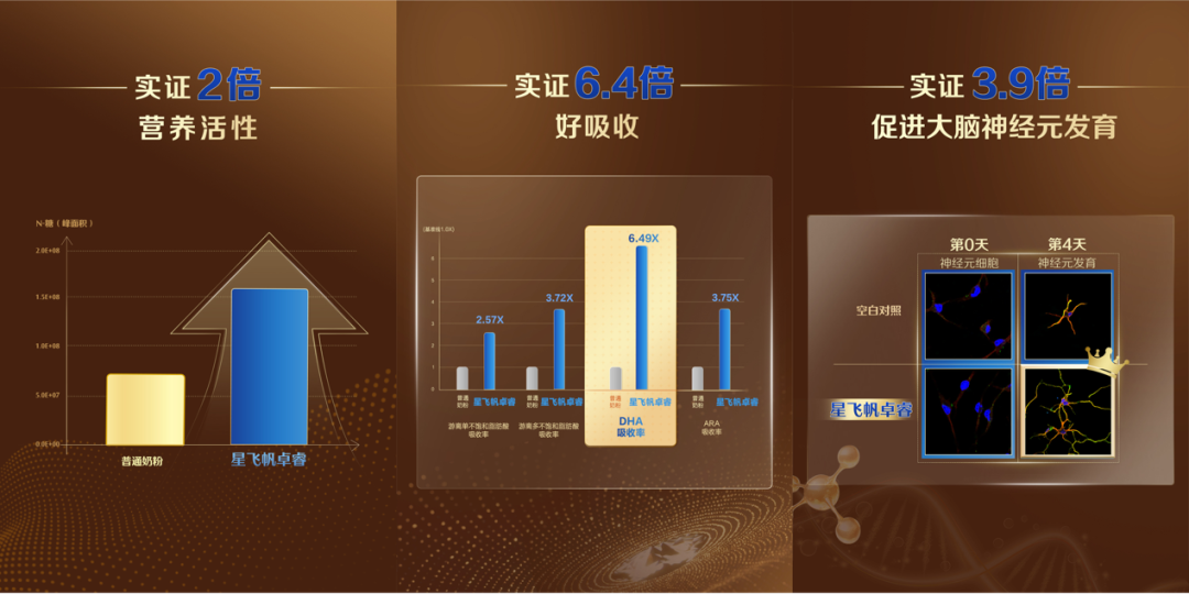 在飞鹤联合多家知名高校、机构合作的研究报告中显示,星飞帆卓睿已取得2倍营养活性、6.4倍好吸收、3.9倍促大脑神经元发育等多项实证。在营养活性层面,其N糖含量实证达到普通奶粉的2倍,活性营养更接近母乳水平;在吸收力层面,其DHA吸收率实证为普通奶粉的6.4倍;在大脑营养方面,实证其核心营养群能促进大脑神经元发育达3.9倍。作为国内最早开展婴幼儿奶粉临床喂养实验的乳企之一,飞鹤始终重视科学实证,让鲜活营养效果“看得见”。