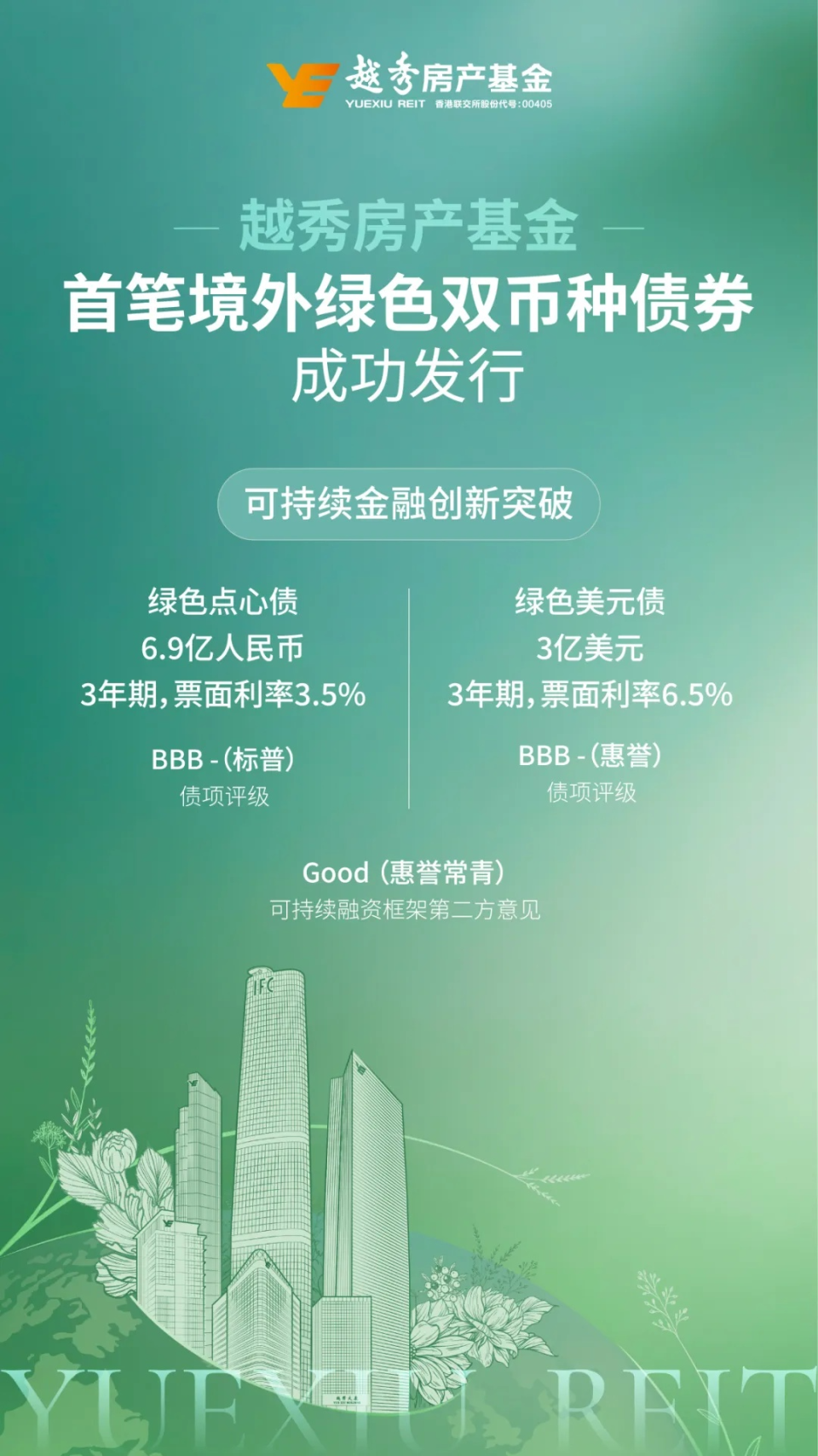 本次境外绿色双币种债券发行,由6.9亿元人民币3年期绿色点心债与3亿美元3年期绿色美元债组成,两大品种分别获得标普、惠誉BBB-债项评级,融资成本与信用资质双双实现优化。其中,人民币绿色点心债票面利率3.5%,创下越秀房产基金境外人民币债券发行票面利率新低;美元绿色债券票面利率6.5%,是基金自2021年后重返美元资本市场的重磅之作。双币种、同期限、高评级的结构化设计,既契合国际投资者的配置需求,又为基金优化债务币种结构、分散汇率风险、稳定融资成本提供了坚实支撑,开启了越秀房产基金境外融资的全新阶段。
