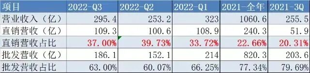 在过去,茅台一度超九成的收入都是通过批发代理销售获得——2016年至2021年财报显示,贵州茅台批发代理渠道收入占总销售收入的比例,分别为91.03%、89.26%、94.05%、91.51%、86.04%、77.34%。而今年前三季度,批发代理渠道收入占总销售收入的比例仅为63.33%。