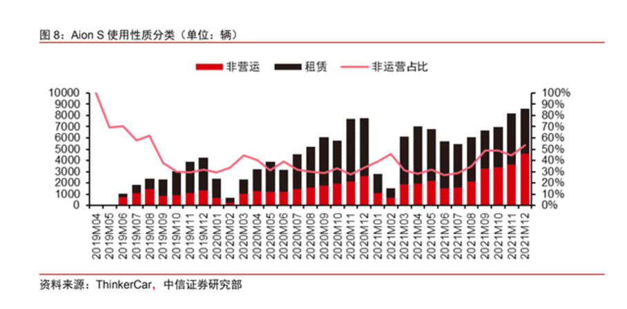 轿车AION S是埃安目前的主力车型,低廉的价格吸引了众多出租车和网约车用户。根据上险量数据,AION S在2020-2021H1的租赁比例为60-70%;2021年7月后,AION S的私家车客户比例才由27%提升至54%。这意味着去年在道路上行驶的AION S中,有近一半是出租车和网约车。