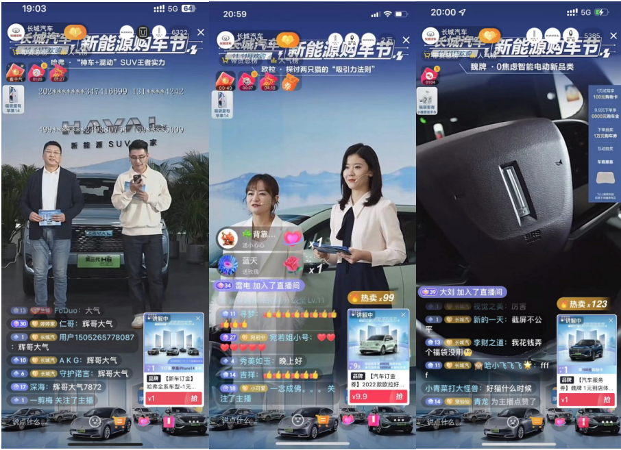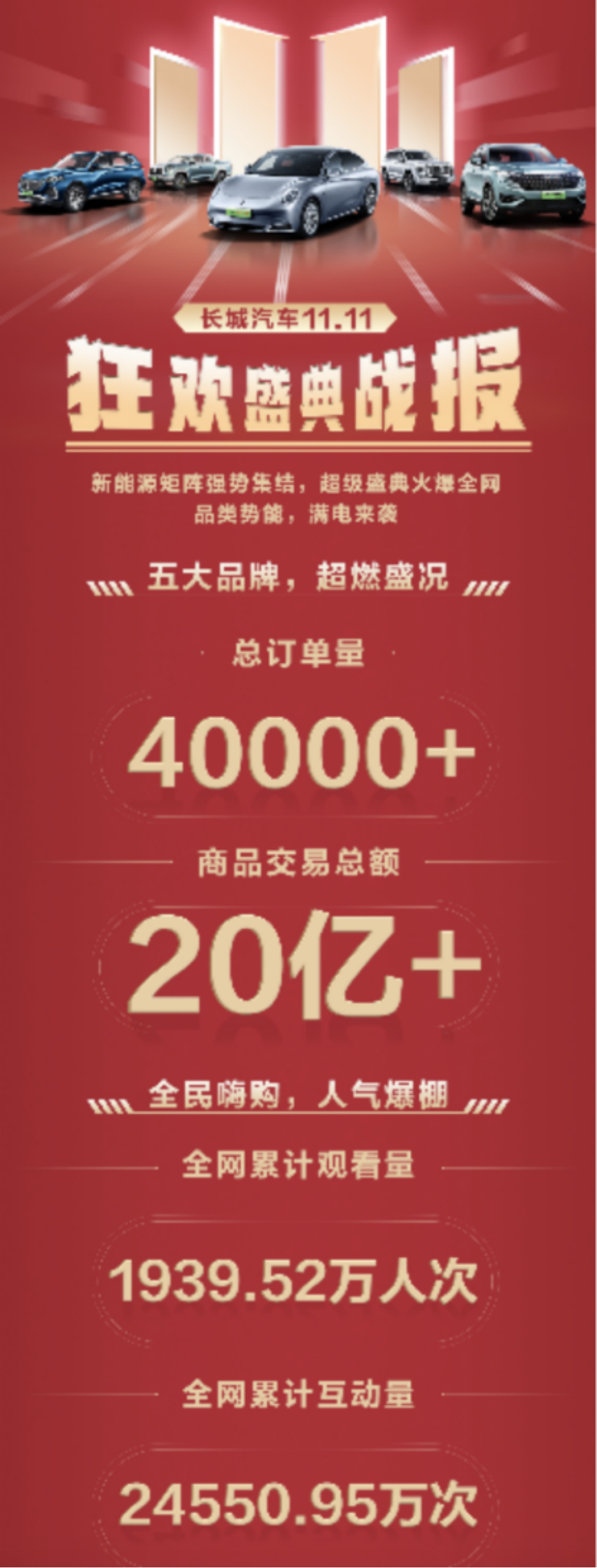 11月10日晚,长城汽车抖音官方直播间,一场以新能源为主题的“狂欢盛典”盛大举行,这是“长城汽车新能源购车节·11.11狂欢购”系列活动中的重头戏。活动当日,长城汽车重磅新能源车型全线集结,高管亲临直播间派送福利、技术大咖实力解读、人气主播花式种草,将本次活动推向高潮,收获不俗成绩。截至该场活动结束,“长城汽车新能源购车节·11.11狂欢购”系列活动累计订单量超4万台,预计销售额超20亿元;直播累计在线观看量突破1939.52万人次,互动量突破24550.95万人次!