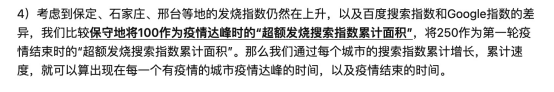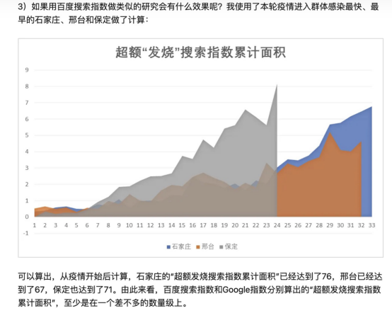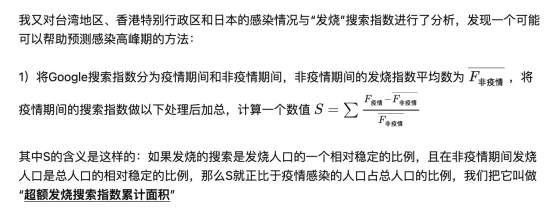 他是怎么预测的呢?总结而言,就是借鉴了已经比较成熟的数学模型,用百度指数去测算疫情情况。 “总体来说就是看超额搜索指数的覆盖面积,当覆盖面积达到一定阈值后就代表人口感染达到一定阈值,感染自然达峰、结束”。