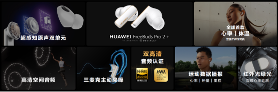 发布会上,华为还重磅推出了一款全新TWS入耳式耳机华为FreeBuds Pro 2 +,在华为FreeBuds Pro 2双金标认证的全链路高解析音质基础上,创新性地搭载了耳边心率、体温检测功能,配合华为运动健康App使用,可支持运动数据记录与信息播报,让用户在听歌与运动的同时,轻松了解自身运动状态,享受更加智慧便捷的运动健康生活。