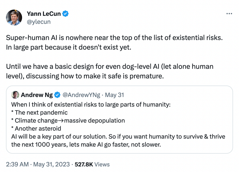 这并不是杨立昆首次发言“AI不如狗”,在上月底350位AI领域大佬签署CAIS组织的联名公开信时,杨立昆转发了同是乐观派华人科学家吴恩达的推文表示:
