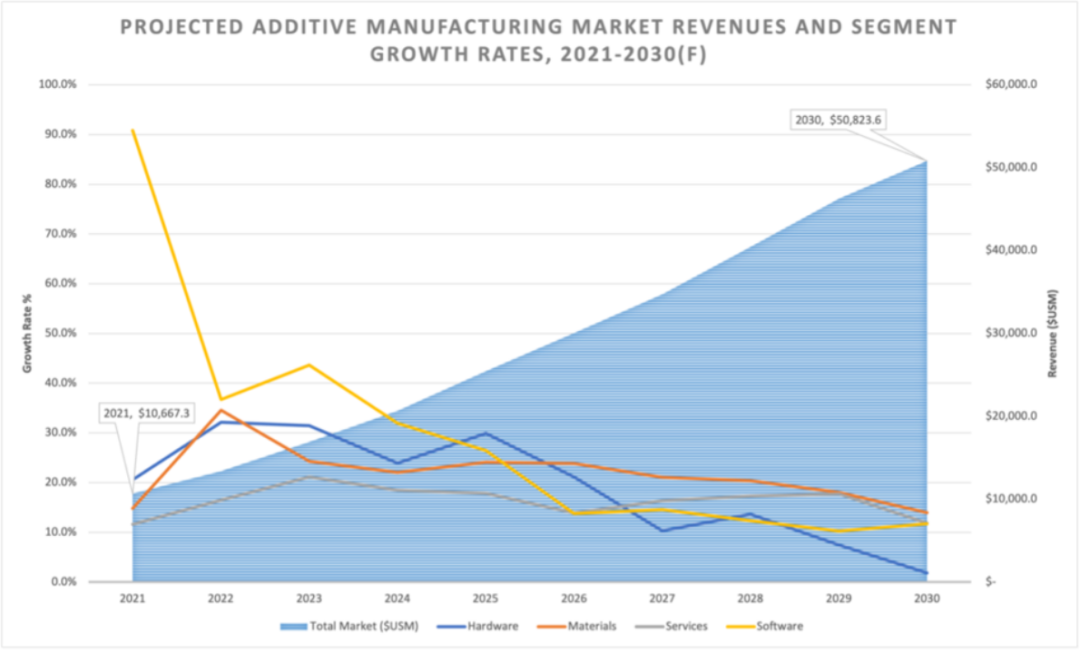 市场研究公司SmarTech Analysis最近发布了增材制造(AM)行业的数据显示,2021年3D打印行业的收入达到106亿美元,还不包括与硬件维护合同和后处理设备相关的收入。报告进一步预测,到2030年增材制造预计将增长到500亿美元以上。