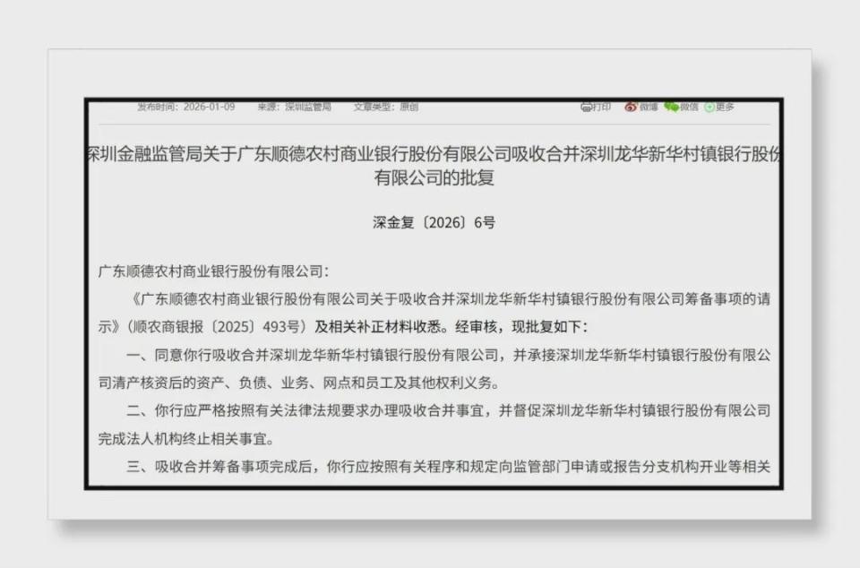 摘要:近日,国家金融监管总局深圳监管局正式核准顺德农村商业银行吸收合并深圳龙华新华村镇银行,