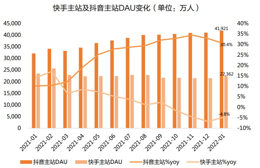 抖音则在2020年6月宣布破6亿后再无主动披露,有媒体曾报道截止去年9月,抖音系DAU为6.4亿,且主要增长是在靠“极速版”拉动。