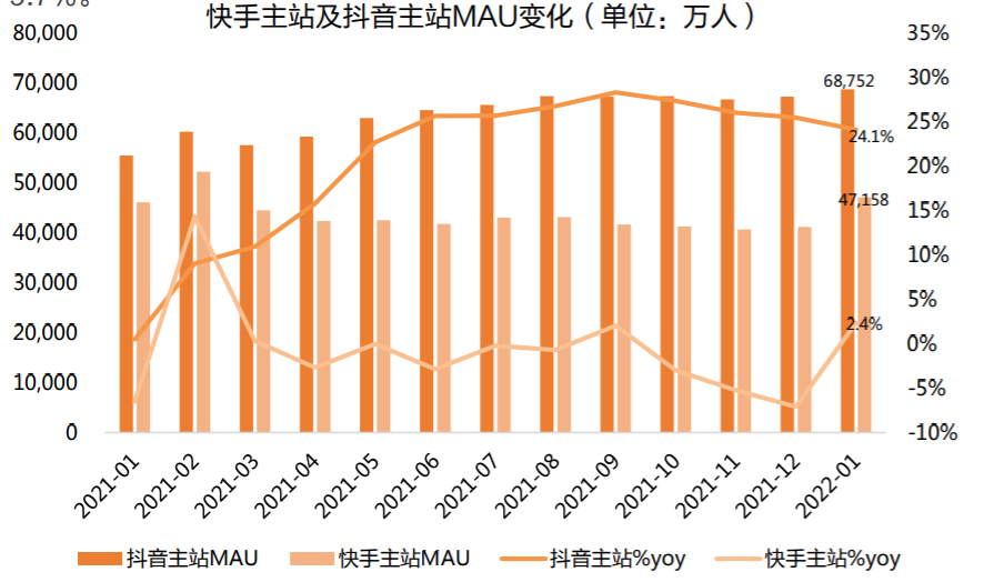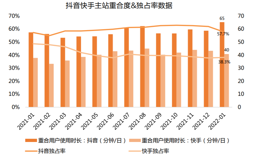 相关数据显示,2022年1月,快手独占率为38.3%,环比增长0.5个百分点;抖音独占率为57.7%,相较于上月( 62.0%)有所降低。