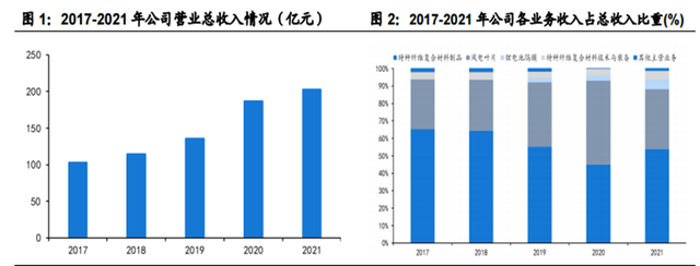 公司先后将风电叶片、玻纤打造成为利润平台的主导产业,同时加速发展锂电池隔膜产业,成为了以玻纤、风电叶片、锂电池隔膜三大主导产业为代表的新材料产业平台。近年来,公司三大主导产业收入占总收入比重均在90%以上。2021年,公司实现了202.95亿元的营业总收入,整体收入规模再创新高。