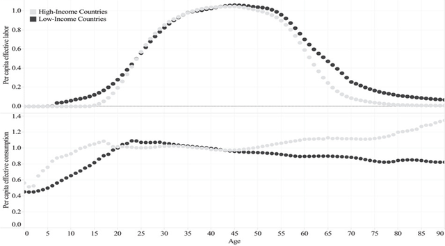 但是,在实际生活中,没有那么简单。世界银行曾在研究报告中发布过一张统计曲线图,图中 “年龄-消费”曲线并没有随年龄增长如期大幅走低,即并没有像小李的直观判断和“人生收支曲线”上所刻画的的那样,年龄越大,消费支出也相应明显减少。相反,高收入国家组,消费支出却持续走高,临近生命尽头的支出甚至还出现了陡升。