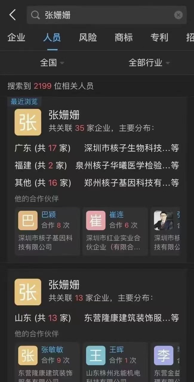 近日,兰州核子华曦实验室将核酸结果录入错误被通报,其背后的核子基因以及张核子、巴颖、张姗姗也引发舆论关注。有网友指出,名为“张珊珊”的个人关联多家新成立核酸检测机构,且多与核子华曦有关。天眼查App显示,张姗姗名下关联企业有37家,开业、存续状态的有34家,其中多数为核子华曦在各地的实验室公司。34家企业中,张姗姗担任32家企业监事职位,在2家合伙企业持有股份,这2家合伙企业执行事务合伙人均为巴颖。