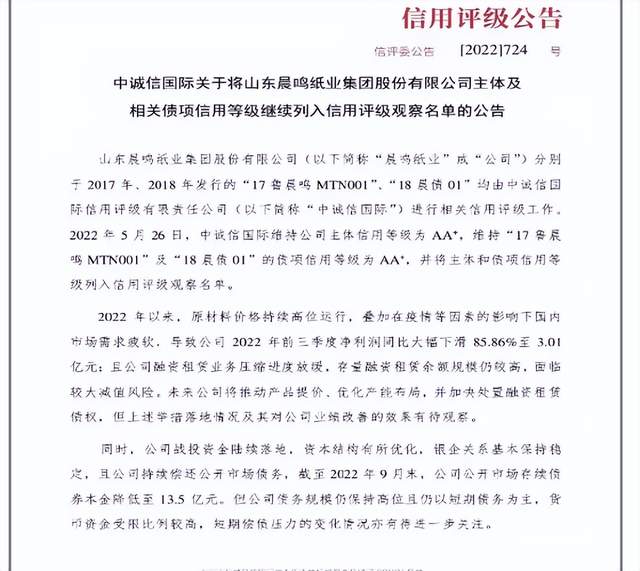 11月25日,中诚信国际公告称,决定维持晨鸣纸业(000488.SZ)主体和“17鲁晨鸣MTN001”及“18晨债01”信用等级为AA+,并将公司主体及相关债项信用等级继续列入信用评级观察名单。