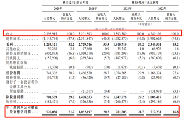 业绩方面,珍酒李渡2020年、2021年及2022年前9个月(简称“报告期”)收入分别为23.99亿元、51.02亿元、42.49亿元;归母净利润分别为5.2亿元、10.32亿元、7.12亿元。