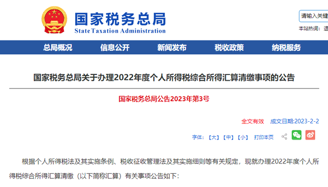 近日,国家税务总局6日发布公告,2022年度个人所得税综合所得汇算清缴办理时间为2023年3月1日至6月30日。2022年度终了后,居民个人需要汇总2022年1月1日至12月31日取得的工资薪金、劳务报酬、稿酬、特许权使用费等四项综合所得的收入额,减除费用6万元以及专项扣除、专项附加扣除、依法确定的其他扣除和符合条件的公益慈善事业捐赠后,适用综合所得个人所得税税率并减去速算扣除数,计算最终应纳税额,再减去2022年已预缴税额,得出应退或应补税额,向税务机关申报并办理退税或补税。