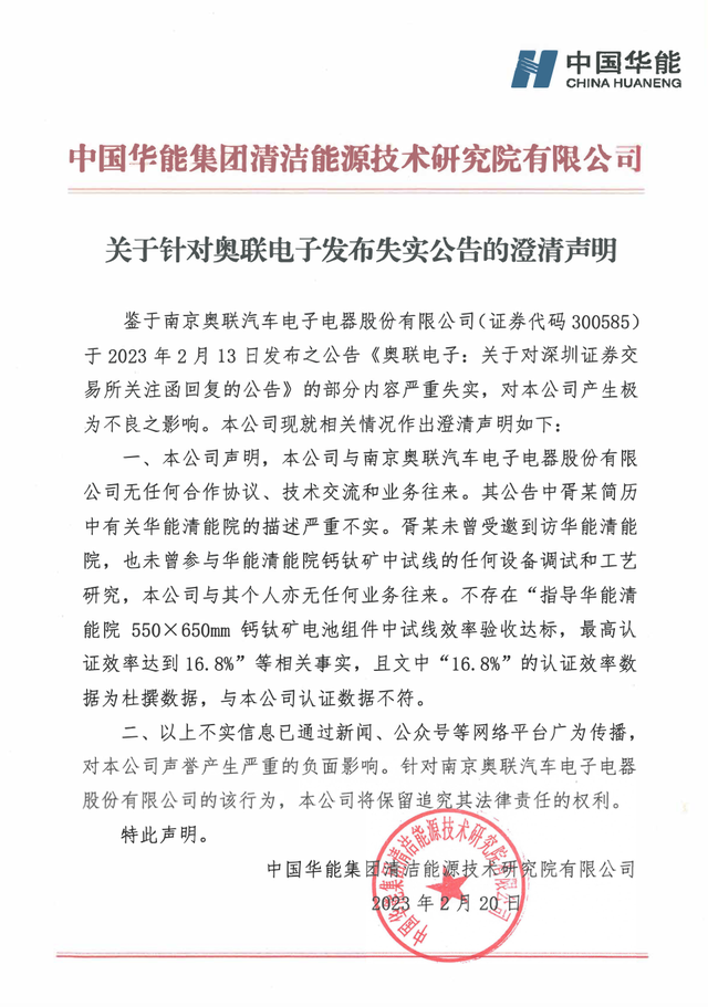 2月13日,奥联电子回函,在列举的一长串胥明军履历中,包括指导完成了华能清能院的项目。2月21日,华能清洁能源研究院发布《关于针对奥联电子发布失实公告的澄清声明》,指出奥联电子发布的公告部分内容严重失实,公司与奥联电子无任何合作协议、技术交流和业务往来。