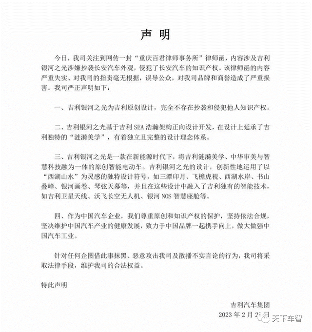在该声明中,吉利明确表示吉利银河之光为吉利原创设计,完全不存在抄袭和侵犯他人知识产权;吉利银河之光基于吉利SEA浩瀚架构正向设计开发,在设计上延承了吉利独特的“涟漪美学”,有着独立且完整的设计理念体系。