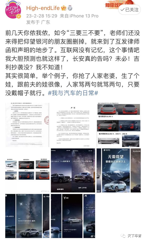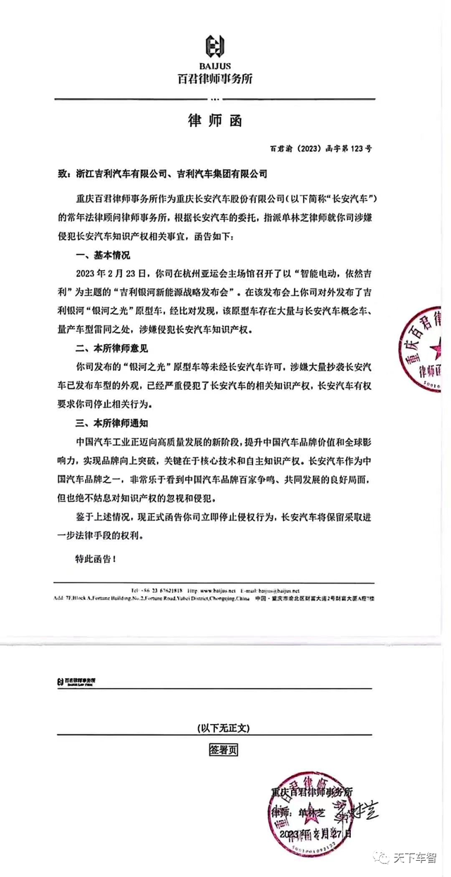 2月28日,一封来自“重庆百君律师事务所”的律师函在网上流传,内容直指5天前吉利银河发布会上“银河之光”概念车。