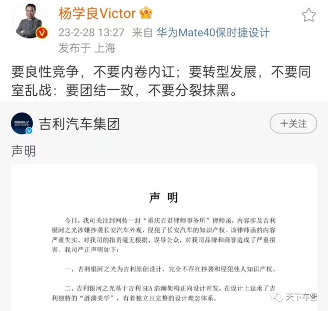 该声明发出后,吉利控股集团高级副总裁杨学良微博转发并表示“要良性竞争,不要内卷内讧;要转型发展,不要同室乱战:要团结一致,不要分裂抹黑。”