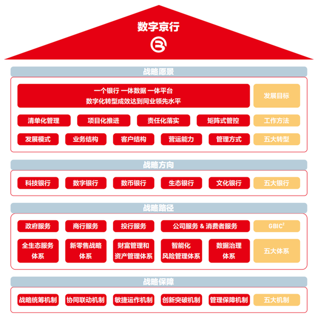 北京银行贯彻总行为分行服务、分行为支行服务、全行为一线服务的思想,运用清单化管理、项目化推进、责任化落实、矩阵式管控的工作方法,以数字化转型统领发展模式、业务结构、客户结构、营运能力和管理方式“五大转型”。