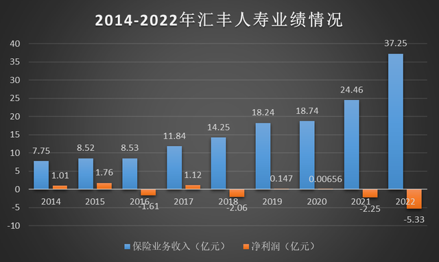 转为外资独资寿险公司后,汇丰人寿的亏损面继续扩大。根据2022年第四季度偿付能力报告来看,2022年公司累计实现保险业务收入37.25亿元,同比增长52.29%,净利润-5.33亿元。