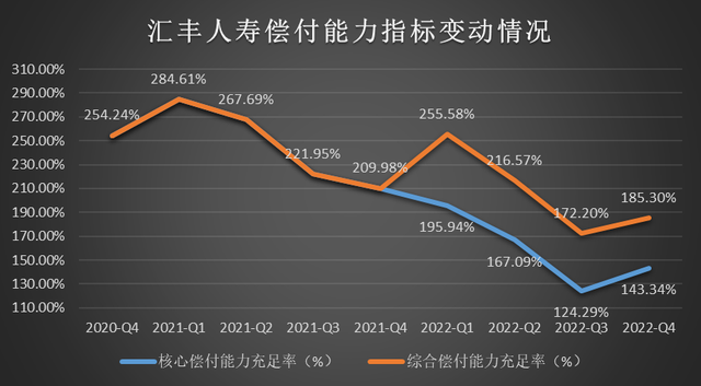 具体来看,截至2022年第四季度末,汇丰人寿的核心偿付能力充足率为143.34%,较本年上季度末上升19.05个百分点,较2021年四季度末下降66.64个百分点;综合偿付能力充足率为185.3%,较本年上季度末上升13.1个百分点,较2021年四季度末下降24.68个百分点。