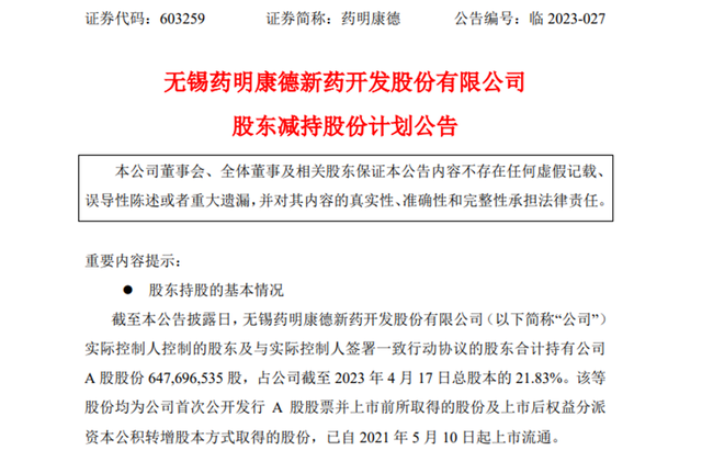 4月17日,药明康德(603259.SH)公告,公司实控人控制的股东及与实控人签署一致行动协议的股东,计划根据市场情况,通过集中竞价和/或大宗交易方式,减持公司A股股份合计不超过8902.27万股,即不超过公司总股本的3%。