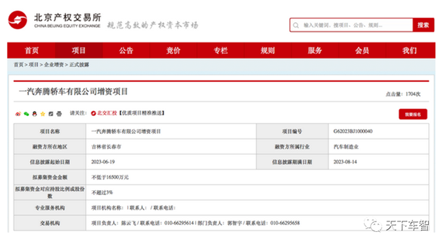 6月末,北京产权交易所发布企业增资项目公告,一汽奔腾拟通过增资行驶引入外部投资方,拟募资金额不低于1.65亿元,对应持股比例为3%。